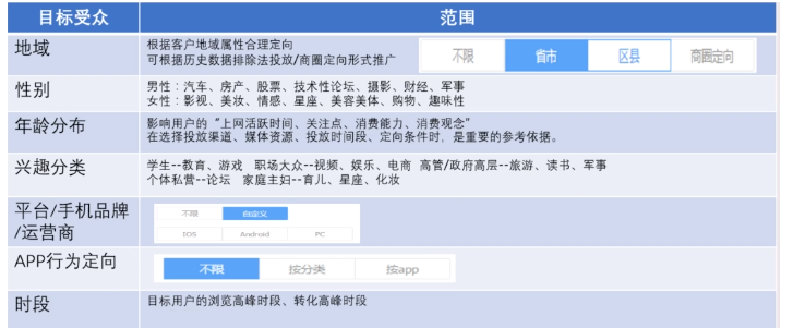 結合廣告主產(chǎn)品的用戶屬性(如年齡、地域、性別、時間段等)來設置,從而提升效果達成轉化。