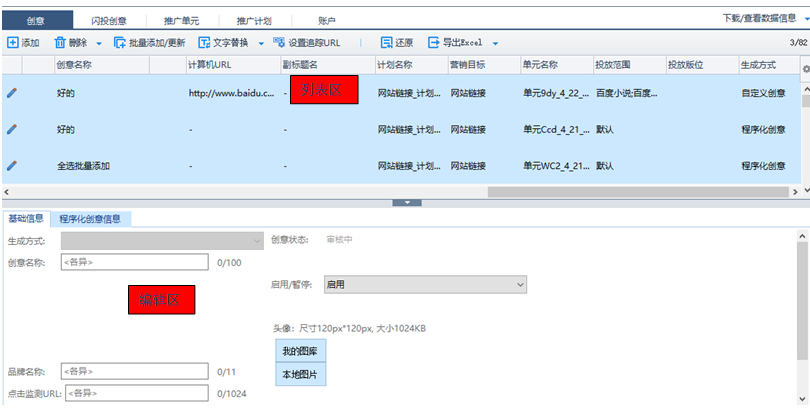 基礎信息(如創意名稱、url)可在列表區編輯,程序化創意標題名稱、樣式僅可在編輯區編輯;