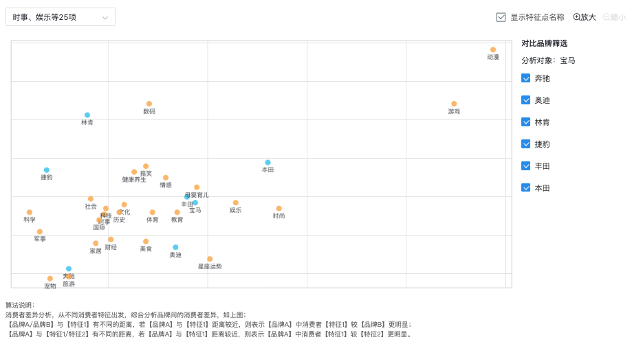 通過相對距離的遠近,可判斷【品牌-消費者特征】間的強弱關系,進而反映品牌消費者在具體特征上的顯著程度;