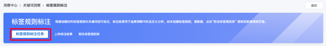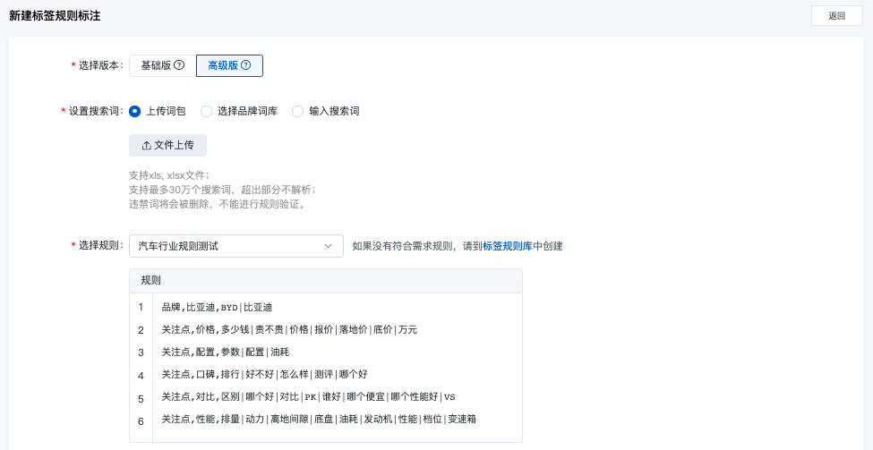 • 標簽規則標注任務,在線定義關鍵詞的標簽規則,系統自動為關鍵詞打標簽