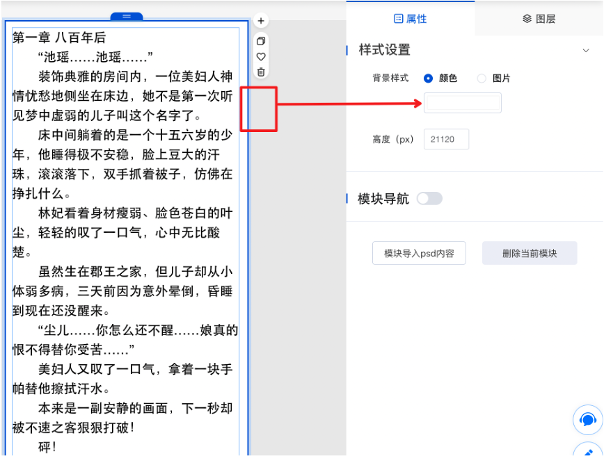 (4)如需修改頁(yè)面底色,點(diǎn)擊文本組件外部的區(qū)域,進(jìn)入到空白組件,在右側(cè)屬性區(qū)【背景樣式】處修改顏色即可。