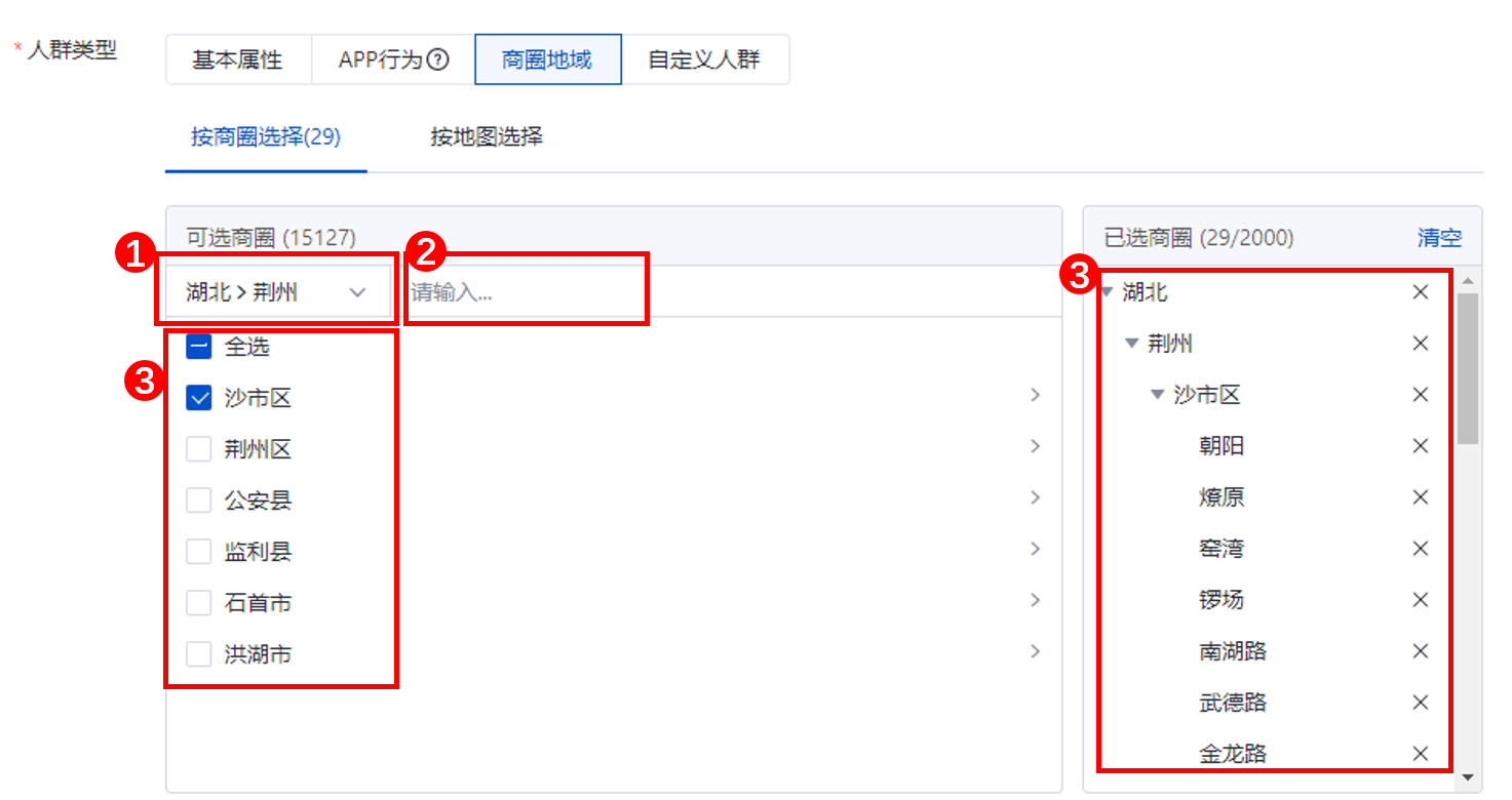 ③所選的商圈在此處呈現(xiàn),可點(diǎn)擊“X“刪除不需要的商圈(按商圈選擇最多可選擇2000個商圈)