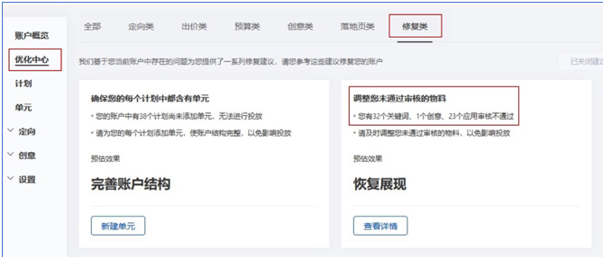 搜索推廣-“優化中心-調整審核不通過的物料”建議升級