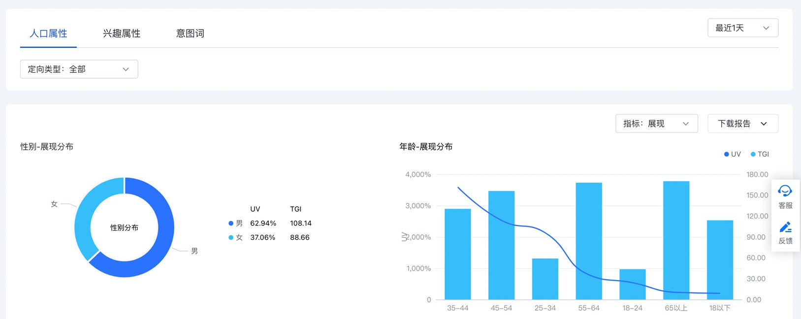 為了幫助廣告主從用戶流量視角查看定向受眾效果,通過(guò)用戶畫(huà)像方式讓廣告主清晰了解其廣告投放的受眾,信息流專項(xiàng)報(bào)告新增定向受眾報(bào)告,通過(guò)UV占及TGI 數(shù)據(jù)指標(biāo),快速定位高意向人群,讓廣告主在洞察投后行為的情況下,提升廣告投放效率與效果!