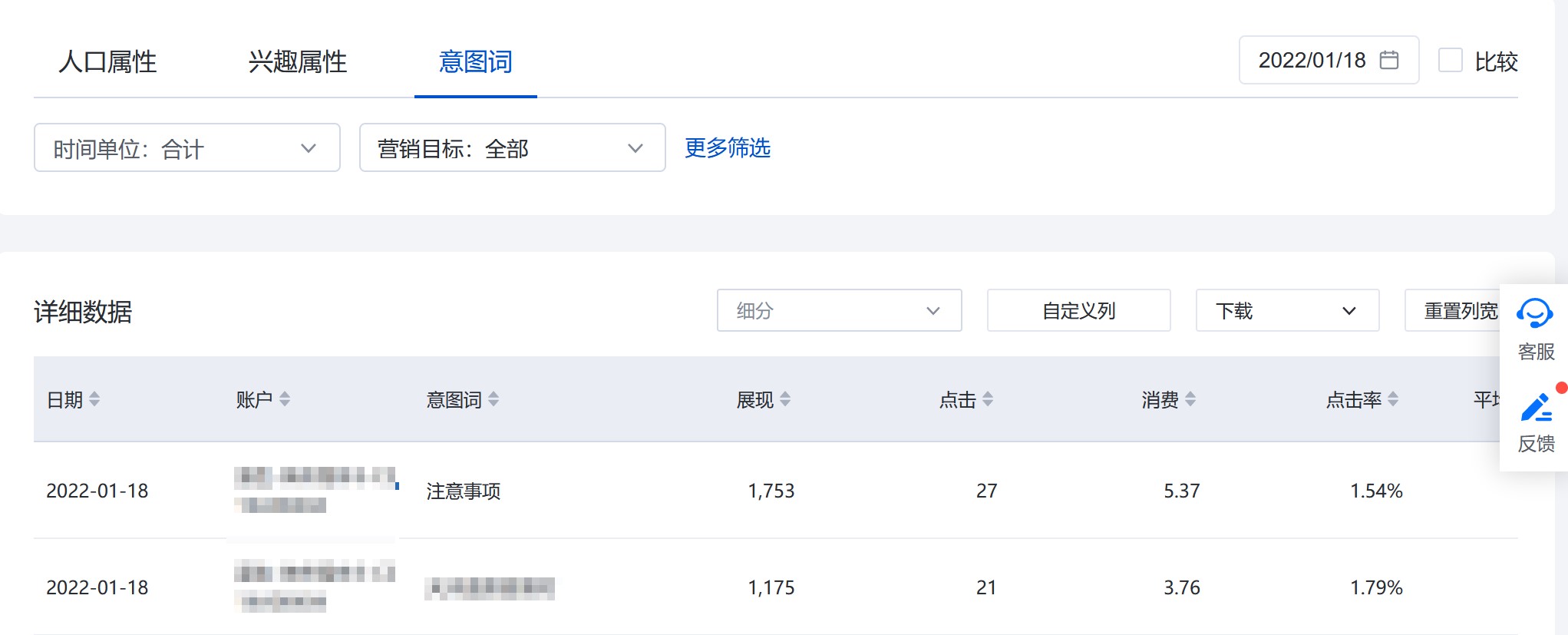 2.2.3 意圖詞:如下圖所示,頁(yè)面功能分區(qū)與其它報(bào)告一致,包括篩選區(qū)、詳細(xì)數(shù)據(jù)區(qū)。