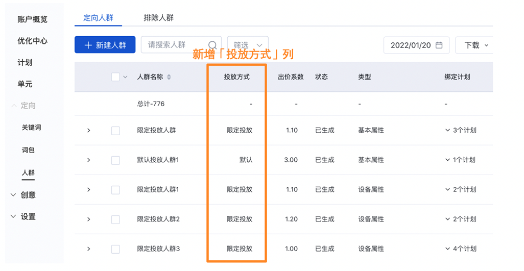 升級點2: 人群投放管理列表新增“投放方式”列:支持查看當前人群設定的投放方式
