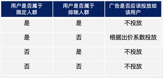 當計劃同時綁定了限定人群和排除人群時,廣告投放規(guī)則如下:
