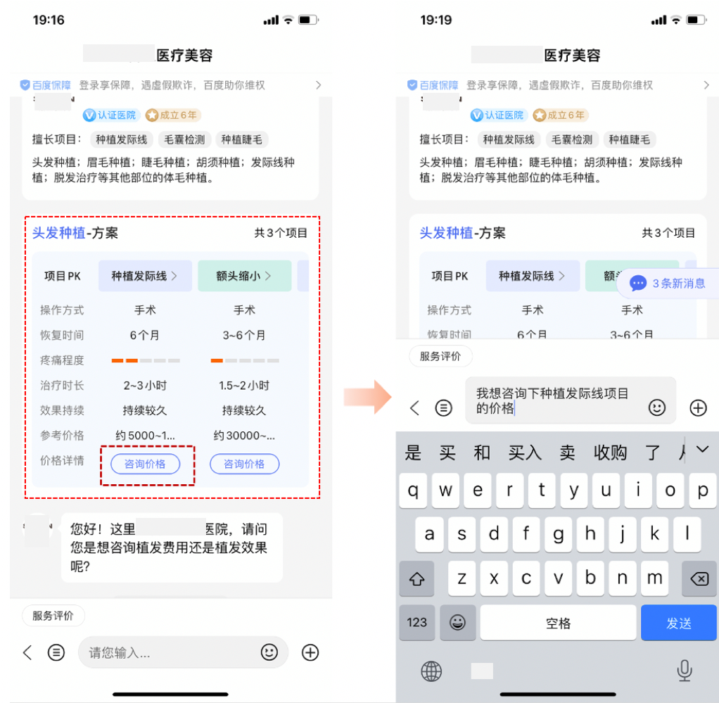 1)網(wǎng)民點(diǎn)擊“咨詢價(jià)格”,調(diào)起鍵盤在輸入框中預(yù)輸入“我想咨詢下XXX項(xiàng)目的價(jià)格”,用戶點(diǎn)擊“發(fā)送”為一條消息;