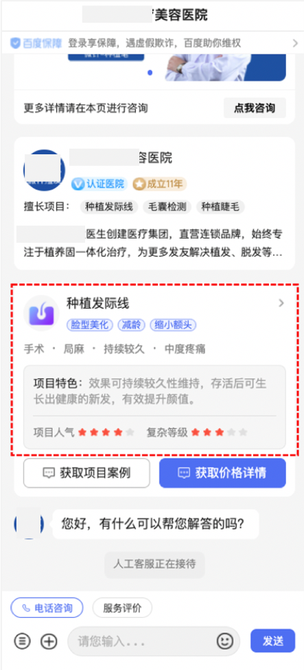 4)項(xiàng)目卡上展示:項(xiàng)目名稱、名稱左側(cè)項(xiàng)目示意圖、項(xiàng)目名稱下方的效果標(biāo)簽(標(biāo)簽最多展示三個(gè))、項(xiàng)目部分信息(包括操作方式、麻醉方式、效果持續(xù)時(shí)間、疼痛程度)、項(xiàng)目特色介紹、項(xiàng)目人氣與復(fù)雜等級(jí)(以星號(hào)表示),以及咨詢轉(zhuǎn)化按鈕“獲取項(xiàng)目案例”、“獲取價(jià)格詳情”;