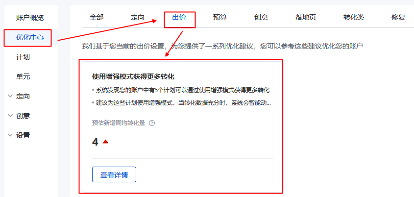 為幫助使用“增強模式”投放的推廣計劃,能夠充分享受到“增強模式”帶來的流量增持紅利,本次“搜索推廣優化中心”升級新增 “使用增強模式獲得更多轉化”建議,幫您快速找到賬戶中適合使用增強模式出價策略的計劃,提升廣告出價競爭力。