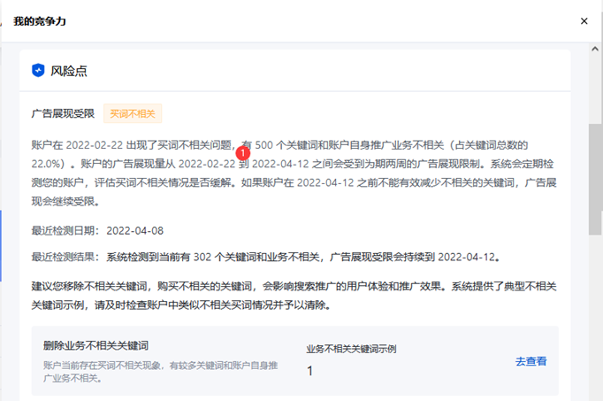 - 【我的競爭力】新增對存在少量不相關(guān)關(guān)鍵詞賬戶披露“買詞不相關(guān)”風(fēng)險點(diǎn)詳情、最近檢測結(jié)果、優(yōu)化建議