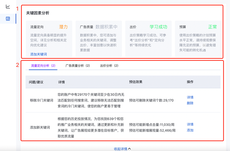 關鍵因素是指影響廣告投放規模和效果的重點因素,系統會從流量定向、廣告質量、出價、預算四個關鍵方向進行洞察分析;