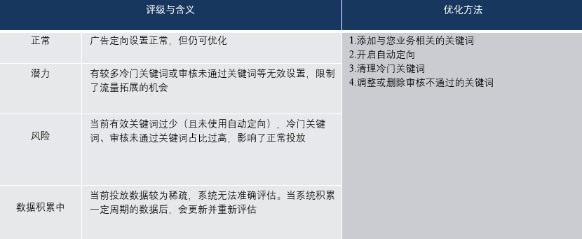 1)系統根據您出價策略所綁定計劃的設置及當前投放情況,對“流量定向、廣告質量、預算”等關鍵因素進行“風險、潛力、正常”評級,對“出價”進行學習狀態披露,幫助您及時了解當前投放情況;