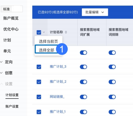Step1:點(diǎn)擊推廣計(jì)劃列表頂部表頭復(fù)選框旁側(cè)箭頭----點(diǎn)擊「選擇全部」按鈕