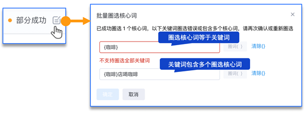 打開「后臺任務(wù)記錄」,找到批量圈選核心詞任務(wù)點(diǎn)擊“部分成功”右側(cè)按鈕彈出二次確認(rèn)彈窗