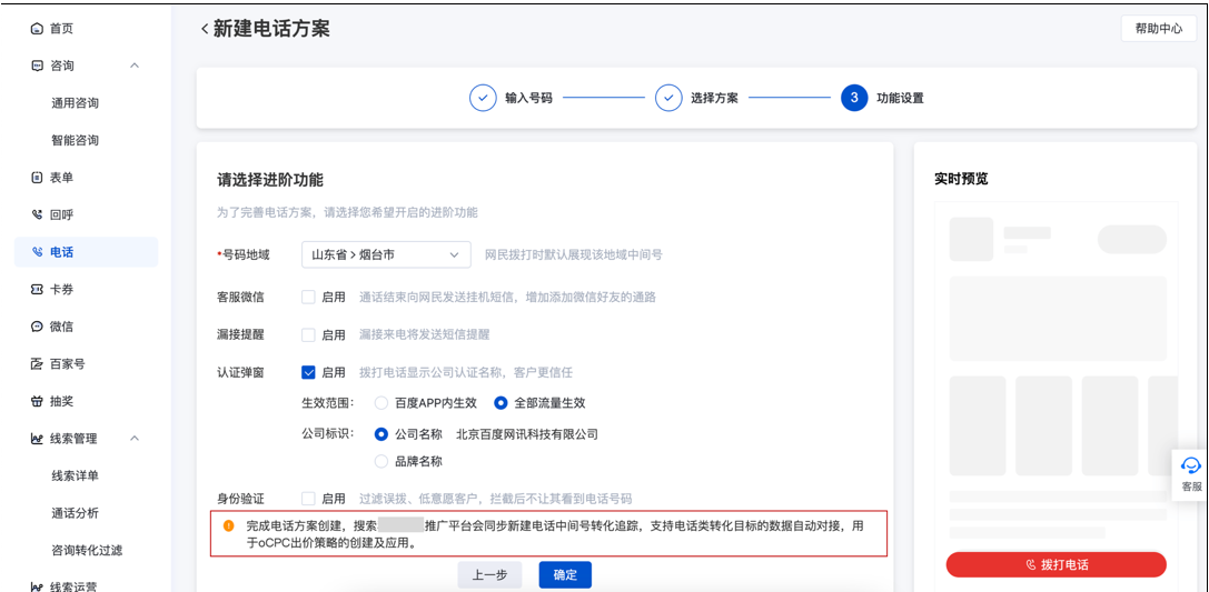 為了提升搜索推廣轉化追蹤在「電話數據授權」接入方式下的「電話撥通」轉化的創建效率,本次升級可支持電話數據授權接入方式下自動創建電話撥通,您只需在營銷通完成電話方案的創建即可在搜索推廣平臺同步自動新建電話撥通的轉化追蹤,支持電話類轉化目標的數據自動對接,用于oCPC出價策略的創建及應用。